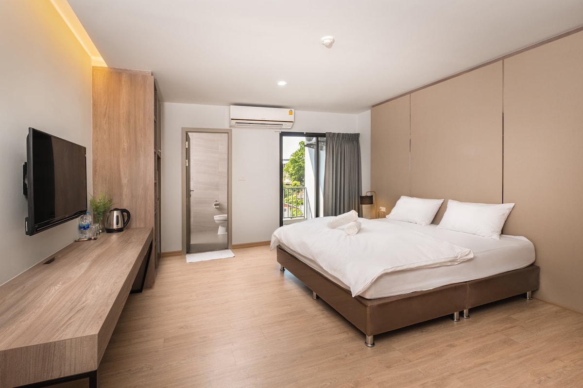 This beautiful Japanese-inspired 60 sqm unit has everything you need for a pleasant stay. The bedroom king-sized bed and personal workspace, and opens onto a spacious semi-outdoor bathroom with a wooden ofuro tub that fits two, and leads to a large walk-in closet. The living room includes a cozy sofa bed and a Ultra HD Smart TV. The kitchen is well-equipped with a microwave, range-hood, electric hob and refridgerator. The large picture window offers a view of the gardens and swimming pool.