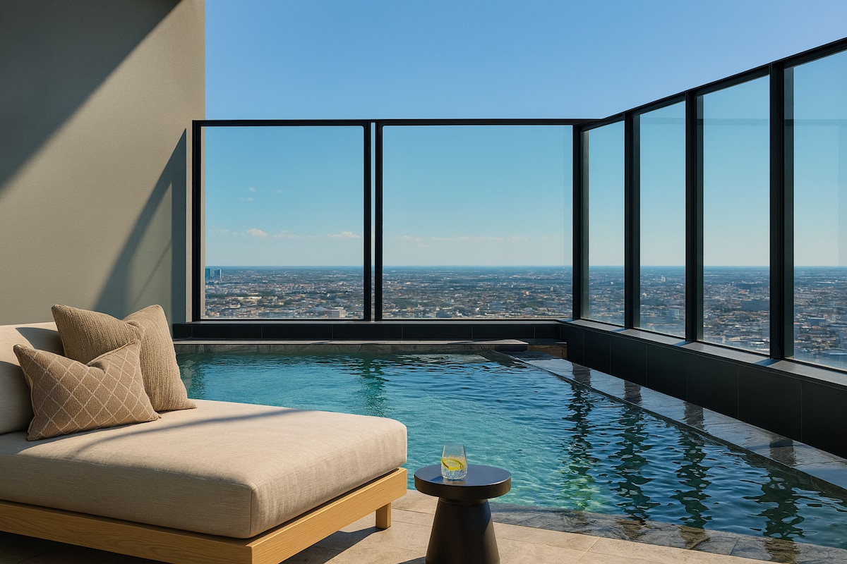 平均评分 5 分(满分 5 分),共 6 条评价带泳池、水疗中心、健身房和站立办公桌的加大双人床房源,靠近地铁