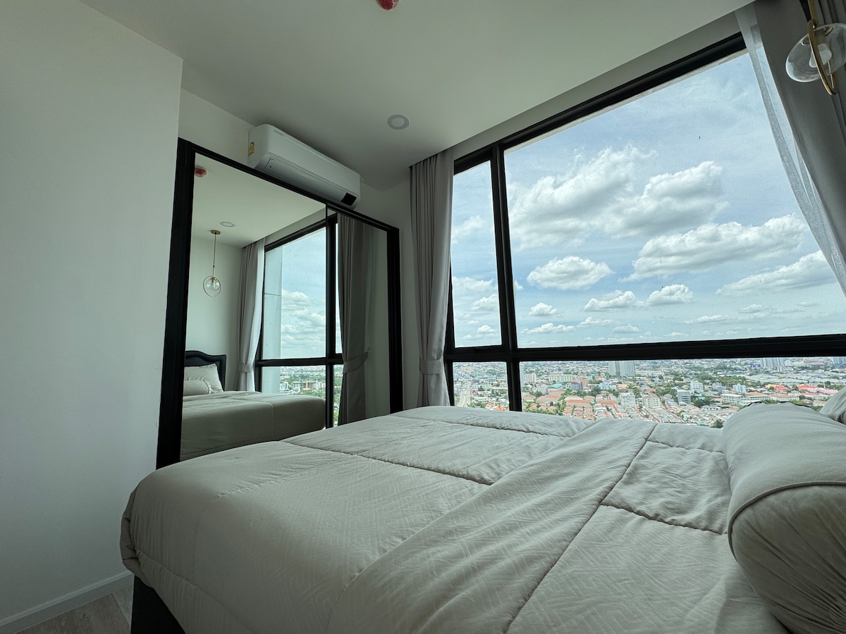 We invite you to our beautiful house in a gated community, inspired by local orchid farms and modern Thai architecture. Enjoy a serene retreat surrounded by lush greenery near Bangkok's western border. Our village offers a 25 m saltwater pool, gym, yoga and pilates spaces, game and cinema rooms, and ample parking. We're a 5-minute drive from Salaya train station or university. This guest room includes a private balcony and bathroom. We share our laundry area to ensure your welcoming stay.
