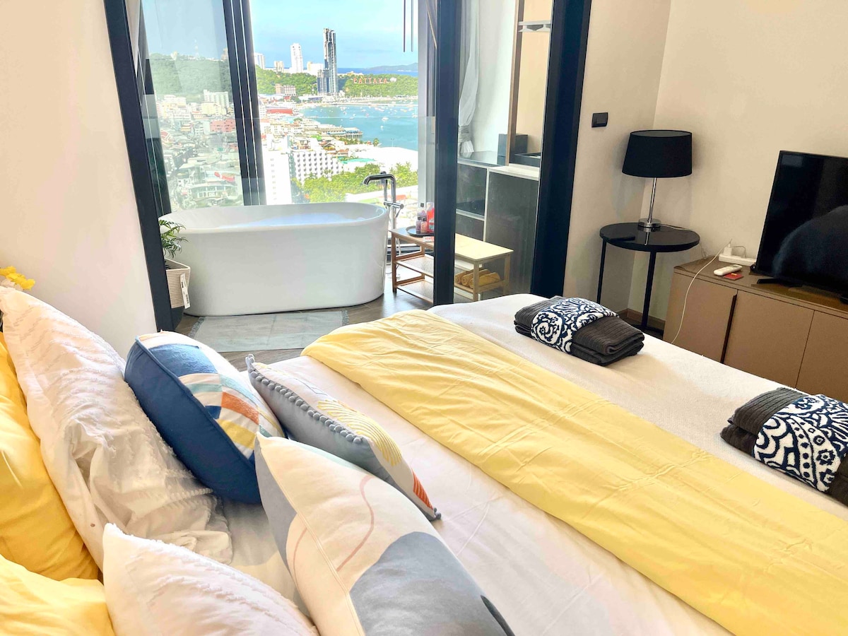 ☀️Perfet SeaView from Top 28th floor KingBed &Living Room+BathTub (Make an Insta-gram moment with BubbleBath on Sky) -Edge Central Pattaya's famous infinity pool is on the 31th floor -5Star/above Grade Facility(SkyLounge, SkyGym, SkyGarden, Dry/SteamSauna, HotJacuzzi, Lobby, etc.) -Best Location in Pattaya center -Beautiful interior with higher cost -Professional cleaning