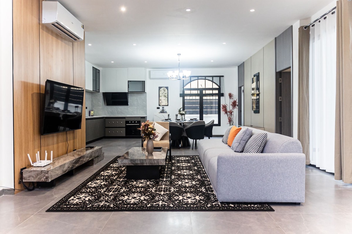 别墅配备了高级的乳胶床垫,让您睡得舒适。 我们的别墅距离芭提雅著名的中天海滩仅800米。可以欣赏美丽的海岸风景,上午在那里购买渔民刚刚出海打捞回来的新鲜海鲜。海边有很多餐厅,还有一个包含小吃、水果、服装、等商品的迷人的小夜市。别墅周边生活便利,711超市近在咫尺,仅需步行200米即可到达,非常便利的满足您的日常需求。 别墅位于知名成熟安全小区Ek Mongkhon Village内,别墅拥有四间宽敞的卧室,4个卫生间。3间卧室都设有独立的卫生间和淋浴间。 这栋别墅位置优越,让您能够尽情领略芭提雅的美丽风光和丰富多彩的生活,为您带来一个充满乐趣与舒适的完美假期! 设施 -私人泳池 -别墅外可停3辆车 -3个卧室都是独立卫生间 -3个卧室1.8米大床,1个卧室1.5米大床 -免费电费+水+高速无线网络 -免费浴巾、毛巾、沐浴露、洗发水、牙刷 -吹风机 -烧烤架 -厨房 没有提供扬声器,啤酒饮料需付费。