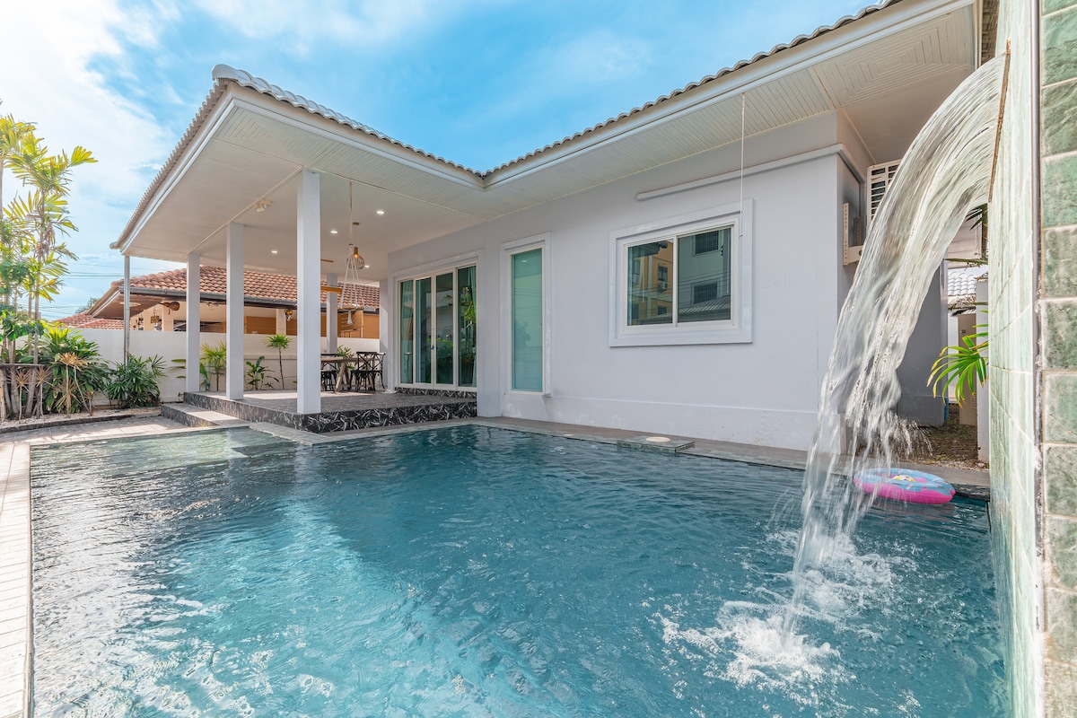 Beautiful modern villa with 3 bedroom and 4 bathroom in the heart of Pattaya, a few minutes from the beaches and the famous Walking Street (about 5 minutes by scooter). Private semi-covered swimming pool 6 x 4 m, depth 1.50/1.70. Waterfall. Quiet residence. Double living room, international TV, WiFi, 3 bedrooms , 4 bathrooms. Large fitted kitchen, Dinning room, terrace with table and armchairs. BBQ. Each room is equipped with air conditioning, fan and TV. All the conveniences of a modern villa.