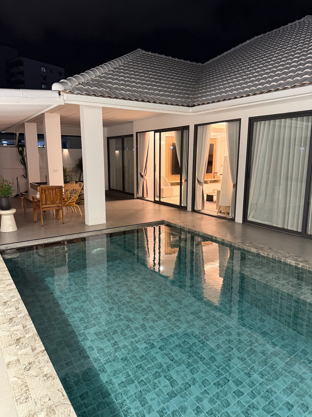 这是一个靠近海边的四卧五卫泳池别墅,位于一个开放社区,可以烧烤聚会唱歌开party~ 🏝距离海边1.3公里5分钟 🐠距离中天鱼市1.3公里5分钟 🥬距离南Makro超市3.3公里8分钟 🍿距离老虎园,射击场,水上市场都很近 别墅里配有台球桌,烧烤架,ktv,超大泳池,100寸超大电视,庭院宽敞,可以跟朋友聚会,烧烤,自己做饭,家庭朋友出行方便~