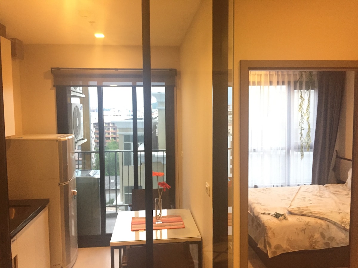 Brand new modern condo at Sukhumvit road close to BTS skytrain. - 6 mins walk to BTS Skytrain Bearing station - Fully furnished room. - Great facilities ( Swimming pool, Fitness, co-working space, Garden) - 1 min walk to Convenience store ( 7-Eleven, Tesco) - 1 min walk to local market, Street foods are a few steps. - Local residential area, quiet peaceful but still convenience to access to skytrain - Sunset view at Balcony with nature light in the morning.