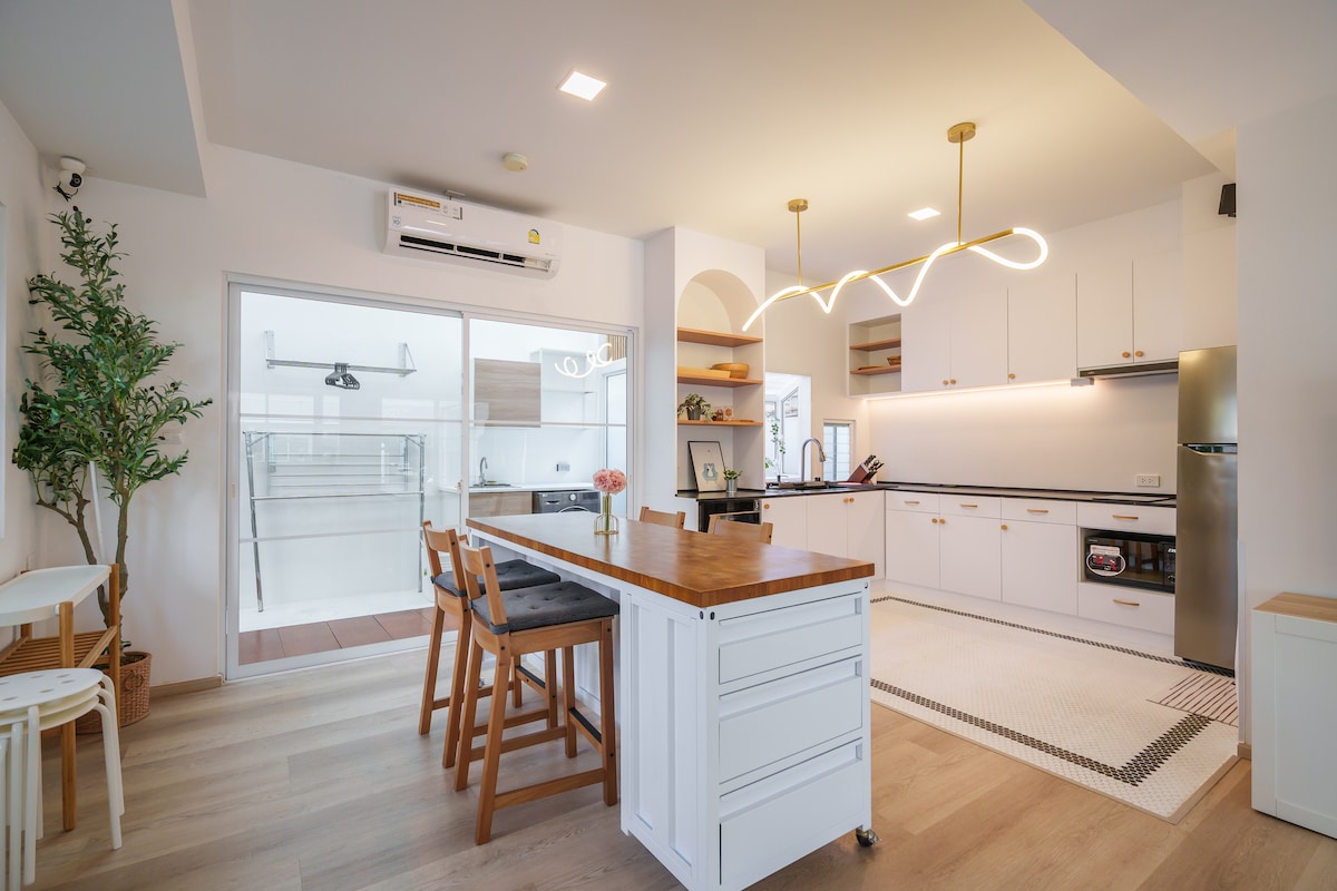 这处特别的房源是由设计师设计的全新理念公寓,整栋房子位于曼谷市中心,距离一切都近在咫尺。包括1间卧室、客厅、餐厅、厨房和1个卫生间。 【地理位置】 - 交通便利:素坤逸核心区,距离鹏蓬地铁站步行980米,步行10分钟即可到达 - 四面佛4.7公里、暹罗8公里、大皇宫13公里 - 贵妇商场步行10分钟可达 -生活便捷:周围遍布24小时便利店,大型超市,商场,知名SPA 【洗手间】 -干湿分离的浴缸、淋浴房及洗手池、衣柜、吹风机,淋浴房配备沐浴露、洗发水和护发素、洗衣液 【提供服务】 -自助入住和自助退房(入住15:00,退房11:00) - 厨房有冰箱、炉灶、微波炉等电器,可以做简单的料理。使用后请自行打扫干净,使用时要注意安全。 -提供洗衣机,并提供洗衣液 -客厅有舒适的沙发、有线电视、空调、茶几 -公寓内及房间内均有WiFi覆盖 - 衣柜、衣架及浴巾