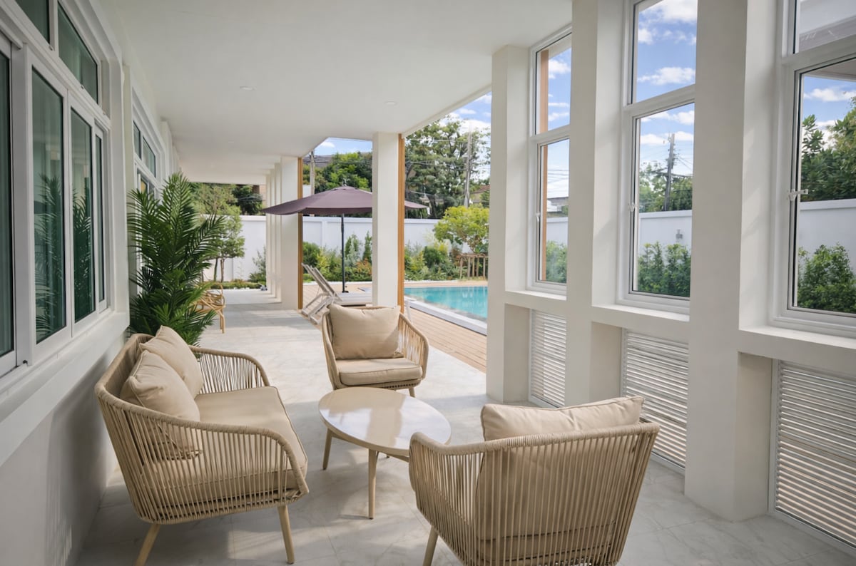 Serene Muji-Inspired Villa with Pool & Jacuzzi in Ekkamai Escape to this 4-bedroom, 5.5-bathroom villa in a quiet, secure area of Ekkamai, Bangkok. Designed in a Muji Zen style, it offers minimalist elegance, warm natural tones, and a tranquil atmosphere. Enjoy a private pool with a jacuzzi feature, spacious living areas, and fully equipped kitchen. Close to cafes, restaurants, and shopping, yet peacefully tucked away. Perfect for families, work, or leisure. Book now for a relaxing stay!