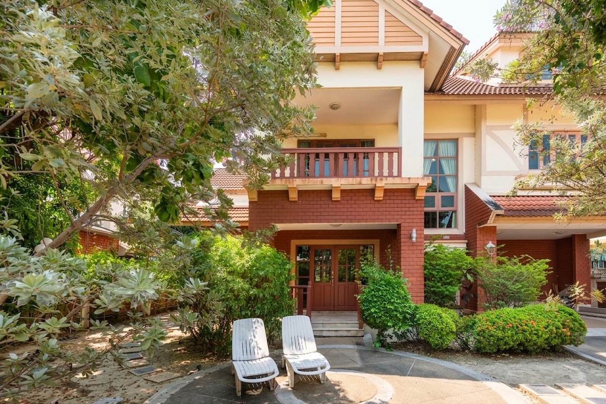 This secure 5 bedroom, 3 bath luxury garden home is ideal for groups of 5-11 people. Great location near major road , taxi stand, and Lardprao MRT subway. It is a quick 1-5 minute walk to a major road, Fave Cafe, Exhibition Center, Amazon Cafe, 7-11 Store, Tesco-Lotus Store, Khrua Khun Ein Restaurant, vegetable shop, and many food vendors. Bilingual Thai-American hosts living next door will assist you in making your holiday safe, fun, and economical.