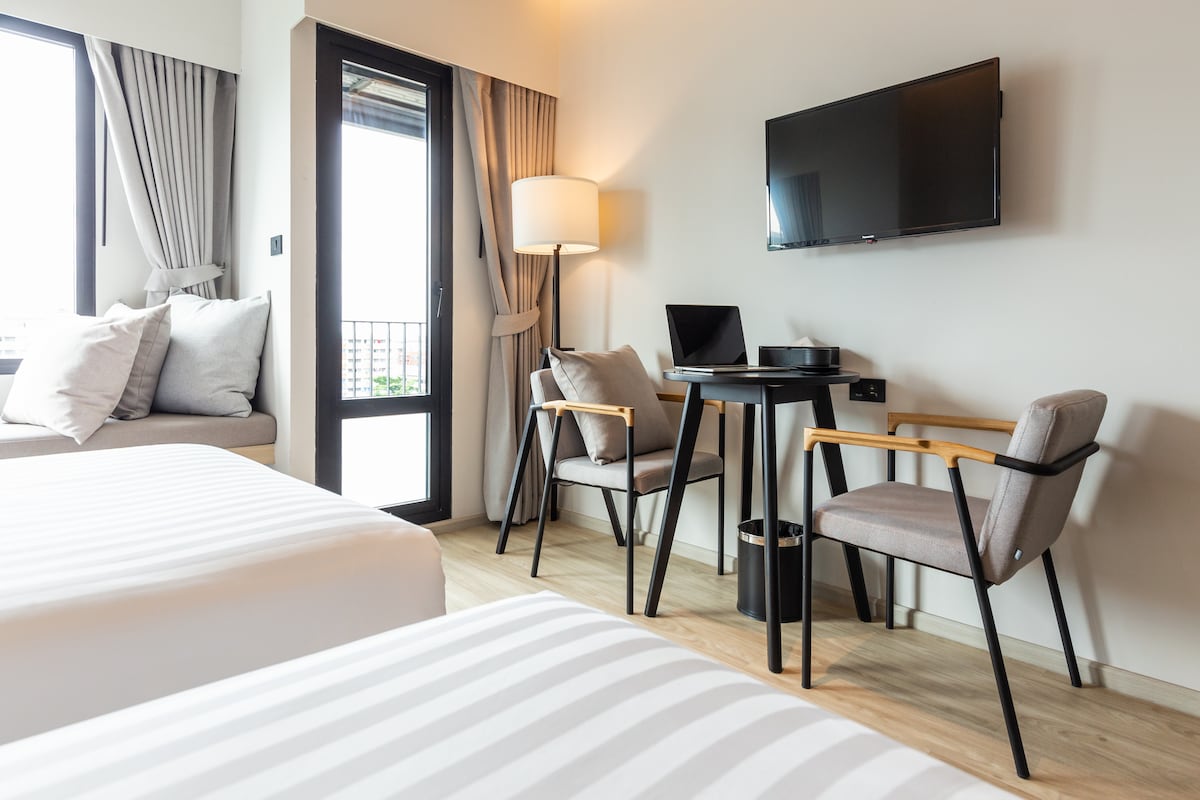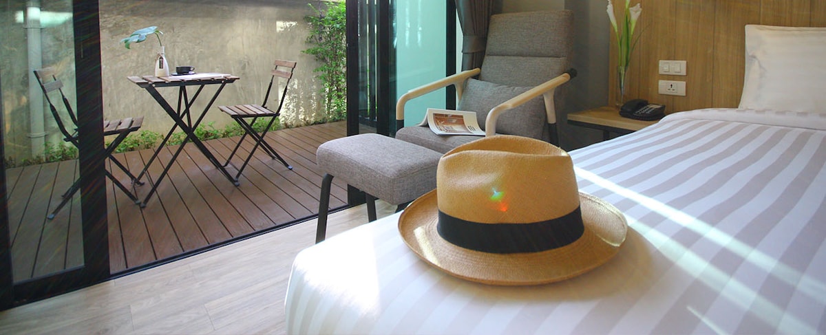 Welcome to The Forest Duplex Retreat – a relaxing nature escape in a quiet green setting. 🍀 The duplex features a bright, high-ceiling living area that feels open and airy. Large glass windows invite natural light and greenery into the space, creating a seamless connection between indoor comfort and outdoor serenity. Imagine wake up to birdsong and soft light filtering through the trees, relax on the soft sofa, work by the window with forest views, or simply enjoy stream your favorite shows.
