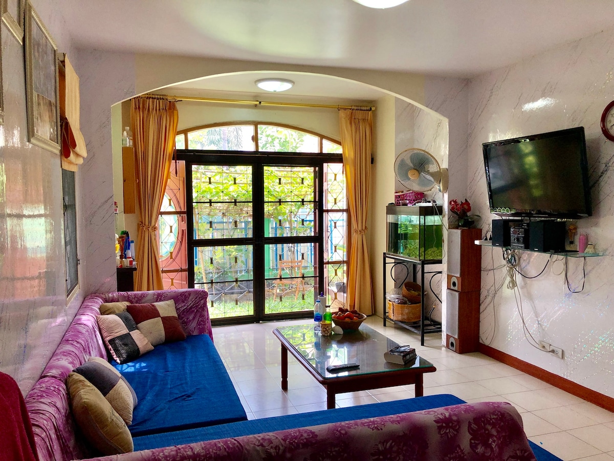 Entire two-storey house with 3 bedrooms and 2 bathrooms in a quiet, secure neighborhood with 24-hour security. Free parking for 2 cars. Perfect for families with cars — up to 6 adults and 2 kids under 12 stay free (extra bed provided). 📍5 km to Central Westgate & IKEA Bangyai, 4.5 km to MRT Khlong Bang Phai. Nearby: 7-Eleven, Lotus, and local market. Within Grab & Line Man area. Fully equipped indoor & outdoor Thai kitchens, BBQ grill, hotpot set, and outdoor smoking area. Relax & feel at home.