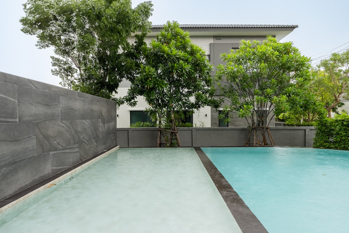 ลืมความกังวลไปได้เลยเมื่ออยู่ในที่พักที่เงียบสงบและกว้างขวาง ใกล้ห้างสรรพสินค้า และ MRT สถานี แยกบางพลู A modern colonial house in a calm, safe and trendy village near MRT Bangphlu station. There are 24 hours security guards. Traffic is normally light. MRT Bangphlu station (3 min) Khaosarn road (20 min) Southern train station (15 min) Downtown (30 min) Chinatown (30 min) Donmuang airport (40 - 50min) Bangkok airport (60-75 min) We focus on delivering warm and friendly hospitality for all valued guests.