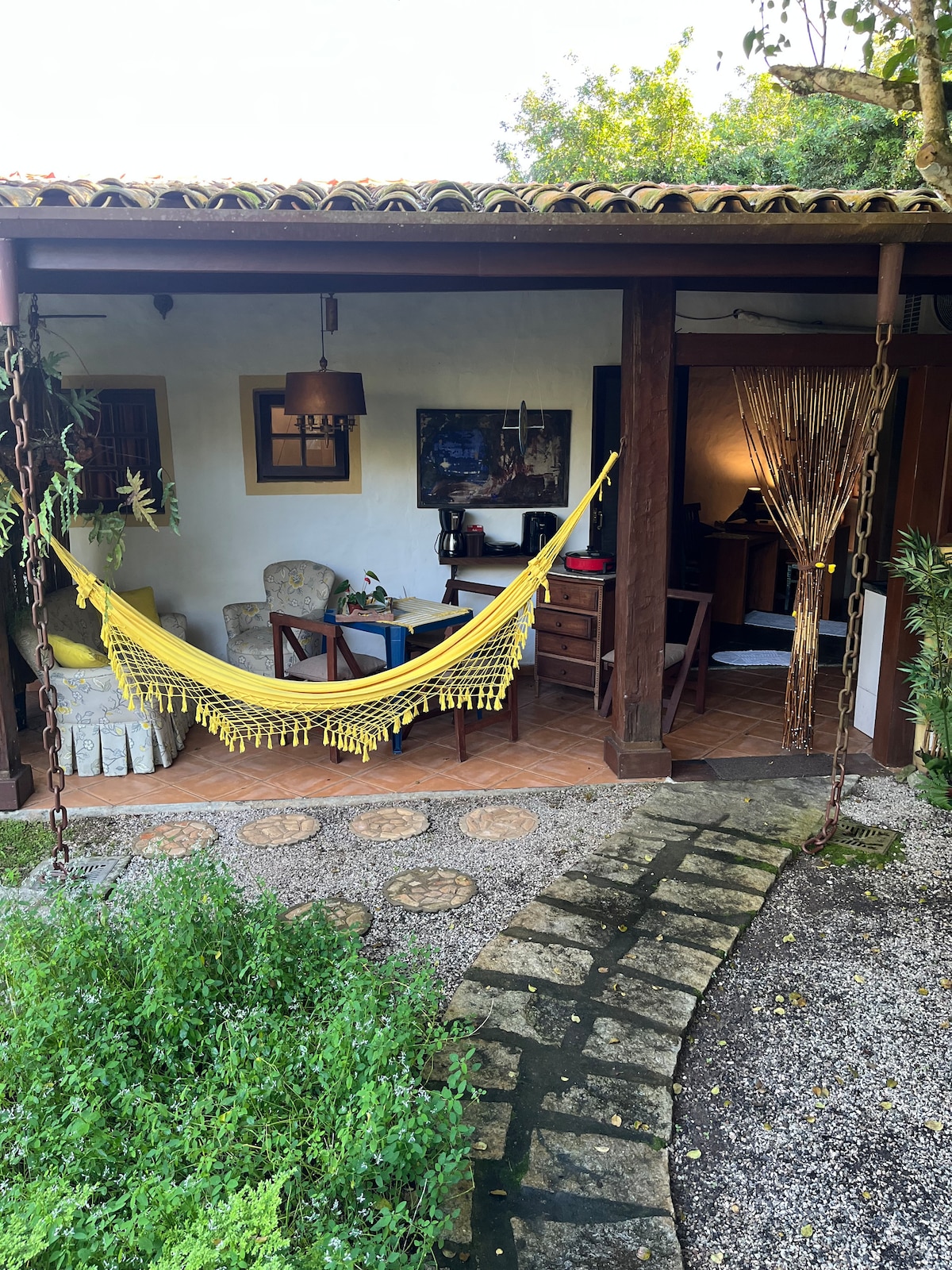 No encontro entre a urbanização e a natureza, o bangalô é um verdadeiro oásis cercado pela floresta, com um jardim tropical exuberante e o canto dos pássaros como trilha sonora. ✨ Perfeito para casais que buscam tranquilidade, conexão com a natureza e momentos de pausa. O ambiente é silencioso e prioriza o som do riacho que corta a propriedade, proporcionando uma experiência única de relaxamento. Se você procura agito, esse não é o lugar ideal. O Bangalô foi pensado para quem deseja desacelerar.