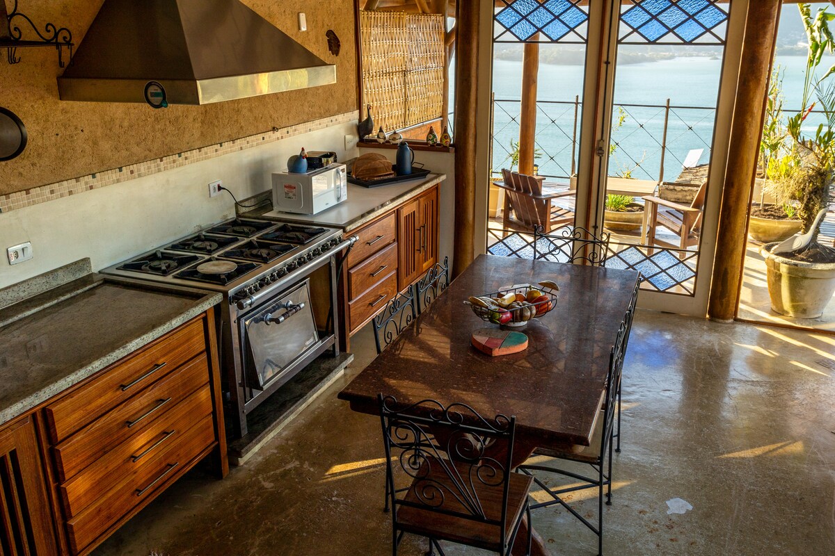Bem-vindos ao Nosso Chalé - linda construção em harmonia com a Natureza e decorado com muito charme e conforto. Situado em condomínio fechado a 3 km da Praia do Curral ao sul da Ilhabela com acesso pavimentado desde a balsa. Integrado à Mata Atlântica e com vista para o mar de todos os cômodos. Perfeito para 1 casal, mas acomoda bem até 4 pessoas. Wi fi fibra óptica, além da possibilidade de 4G para o home office perfeito. Área do chalé e da garagem cercados para a segurança do seu pet.