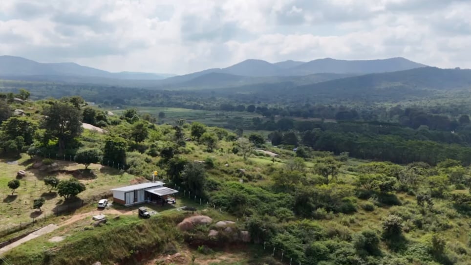 Nestled at the edge of a breathtaking small cliff, Kotta’s Sunset Retreat offers sweeping views of the surrounding landscape. This modern, 100% solar-powered retreat boasts floor-to-ceiling glass walls that frame mesmerizing sunsets over the horizon. Perfect for those seeking peace, natural beauty, and the thrill of living on the edge, this serene escape is home to vibrant peacocks and endless tranquility. A place where bliss meets nature in a spectacular setting.