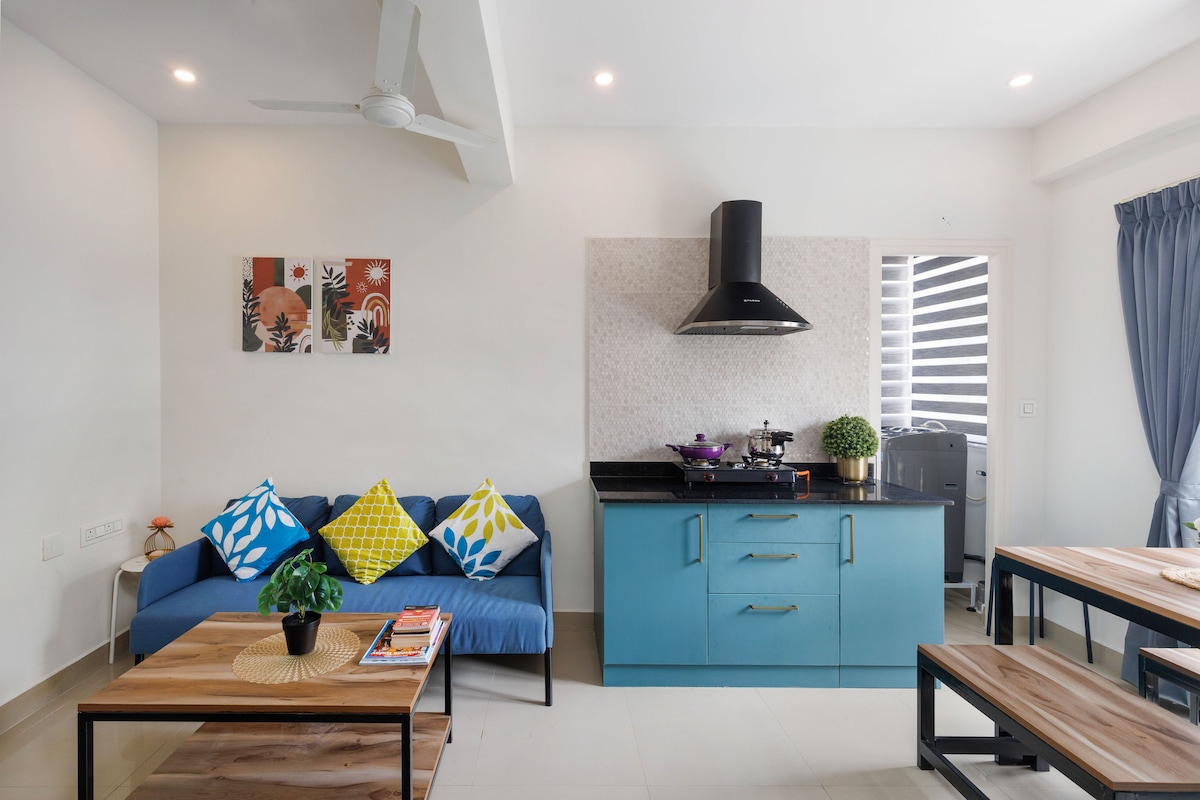 Spacious 600 square feet Designer 1BHK Suite with Private Balcony | High-Speed fibre optic Wi-Fi & Smart TV with streaming platforms, Work/Dining Desk, 24/7 power backup for uninterrupted work and comfort |Luxe King Bed & Orthopaedic Mattress ,wooden wardrobes for storage | fully equipped Kitchenette | Couch Bed in living room , Max.Occupancy 4 | Elevator access, professional housekeeping and access to paid laundry on site for long stays| Located in Central Bangalore | LGBTQIA++ Affirmative