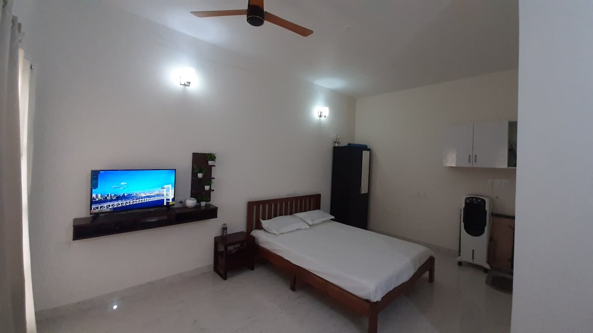 This independent studio is located on ground floor, it has private attached bathroom and kitchenette. The space opens out into a large garden, with mango and coconut trees. This property is located 1 km from the bus stop, supermarket and restaurants! It is part of a larger farm property, which has a few more Airbnb listings. AC available for extra charge: ₹300