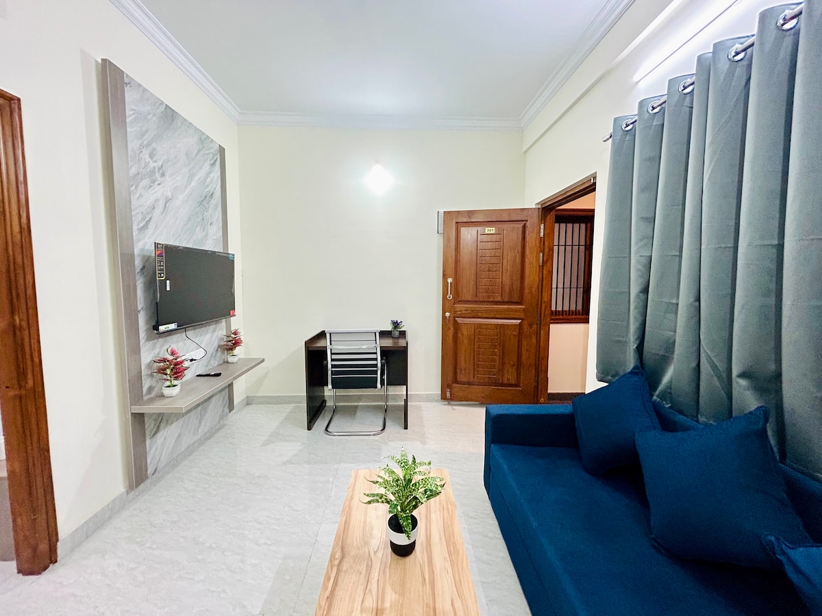 Welcome to our Lakeview apartment! Experience modern comfort in Bangalore's serene setting. Relax in our cozy 2 BHK flat with AC (in one bedroom). Enjoy seamless streaming with 100mbps WiFi. Enjoy the convenience of free car parking, available inside the premises, making your commute effortless. Indulge in complimentary tea and coffee, and rest on premium mattresses with quality linens. Shampoo and body gel are provided for a worry-free stay. Enjoy comfort and convenience at its best!