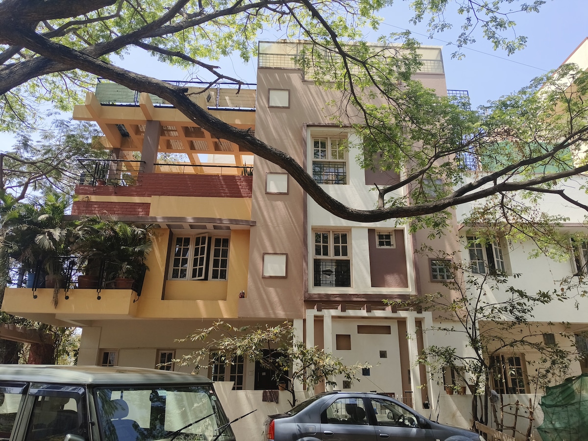 A great space for two or three travellers in the middle of the city, AC in bedroom, with a beautiful garden terrace overlooking the army cantonment. Close to all IT and manufacturing hubs in Bengaluru, and even closer to the top party destinations of the city. Well lit and decorated ambience welcomes you as you check in. All conveniences available nearby, including hospitals, malls, restaurants and departmental stores. Accommodating host presents this space on the third floor. NO LIFT HERE