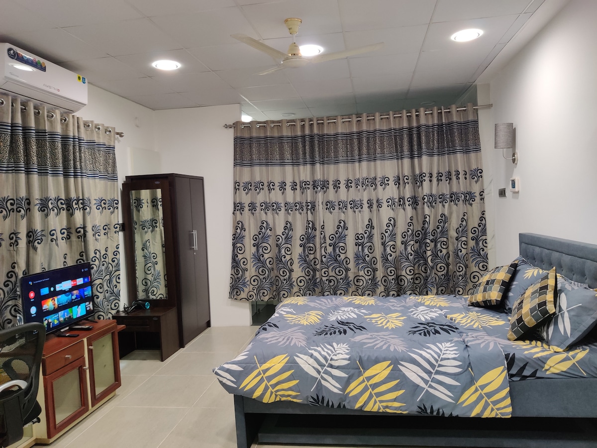Forget your worries in this spacious, neat, tidy & adorable place situated in a calm neighborhood. The place is cosy and just right for working and relaxing. Located just 5 mins from Manyata Tech Park with easy accessibility to the airport. It has a built-in work station, kitchenette, clean bathroom and ample space to park inside the premises. With 24/7 hot water and Wi-Fi, this place can give you the peace of mind you need for your work or leisure trip.