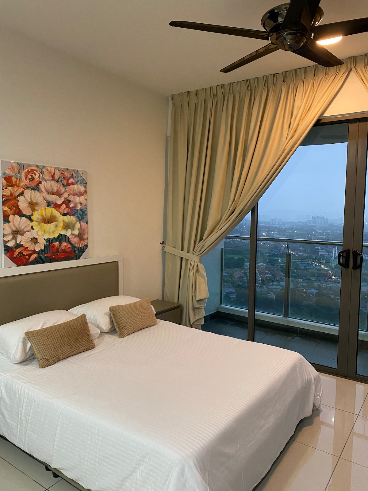 A cosy duplex on the highest floor of the building (Level 21), with a queen bed and a 3-seatersofa. Suitable for both short- and long-term stays. The building is in De Centrum Mall, with shops such as Super7 (supermarket), Tealive, Mr. DIY, SPP Bookstore and 7-Eleven among others, and facilities like launderettes and a clinic (Poliklinik MyMedik). •Check in time: from 3PM •Check out time: 12PM