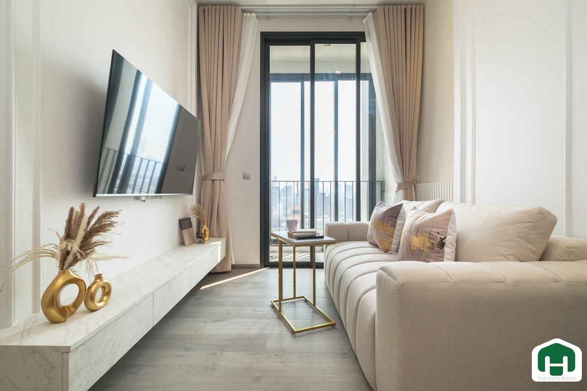 2-bedroom duplex with sweeping panoramic views over Bangkok. Floor-to-ceiling windows flood the space with natural light, while the modern Japandi interior creates a calm and elegant atmosphere ideal for couples, families, or business travelers. Fully equipped kitchen, spacious living area with a 65” smart TV & private balcony. Direct access to a gym and wellness spa on the same floor, plus a rooftop sky pool and sun deck above. Food hub, cafés, and a 24/7 Mart are located inside the building,