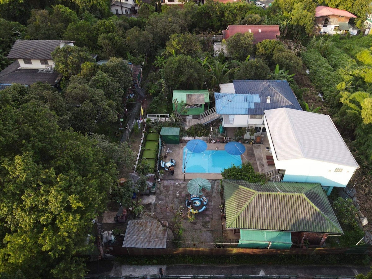 This accomodation is set apart by its tranquil location and available facilities. Charlie & Raewyn are your hosts at this small family run resort.Both Thai and English spoken. Set in a quiet location on the outskirts of Bangkok there are many buses and taxis to take you to the centre of the city(14kms away). We are excited to announce that the new Purple Line skytrain has opened nearby and can connect you to the airport (combination skytrain,underground and Purple line)as well as to the heart of the city. Our station is Wong Sawang. There is access also to the water bus pier at Nonthaburi. We are within walking distance to a shopping centre and food court. Nearby local food stalls sell local food or use the fully eqipped kitchen facilities and relax in the large dining /entertainment area. Other on site facilties include a swimming pool,exercise equipment, pool table,tranquil garden settings etc.There is also a large automatic washing machine for guest use.Free laundry powder is provided.