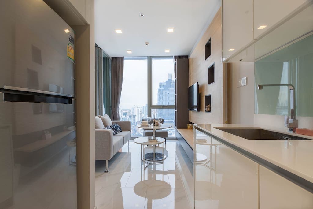 A spacious entire apartment with private bath, kitchenette, living/dining, 1 bedroom with designated working area, and balcony. Enjoy the wide windows for uninterrupted views and plenty of sunlight, increasing airiness for a more relaxing stay. Enjoy all the conveniences of city-life, including: - 5 min to BTS Asok, MRT Sukhumvit - 5 min to Terminal 21, Emporium/Emquartier and Benjasiri Park - 1 min to 7-11 convenient store - Lots of street food, cafe and taxi/bikes