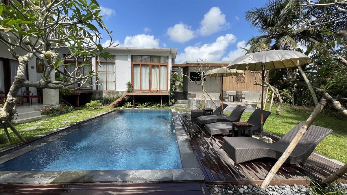 Experience your 130m² villa blending Japanese minimalism, Peranakan heritage, and Balinese warmth. Enjoy complete privacy with cozy living room, pantry kitchen, 2 bathrooms with bathtubs, and private pool with loungers. The only shared spaces are our serene garden featuring a majestic tree beside a traditional Balinese prayer stone. Perfect for up to 3 guests. Every detail enhances your connection to Bali's serene environment.
