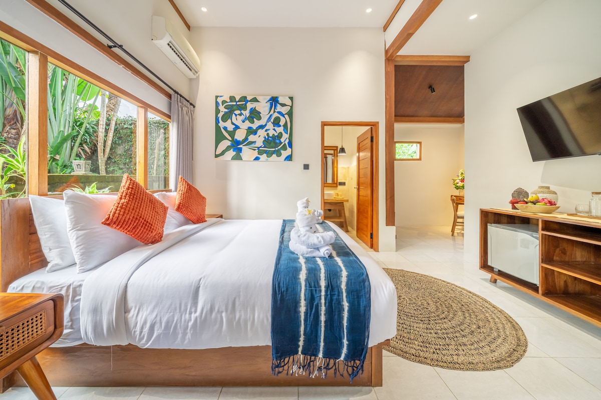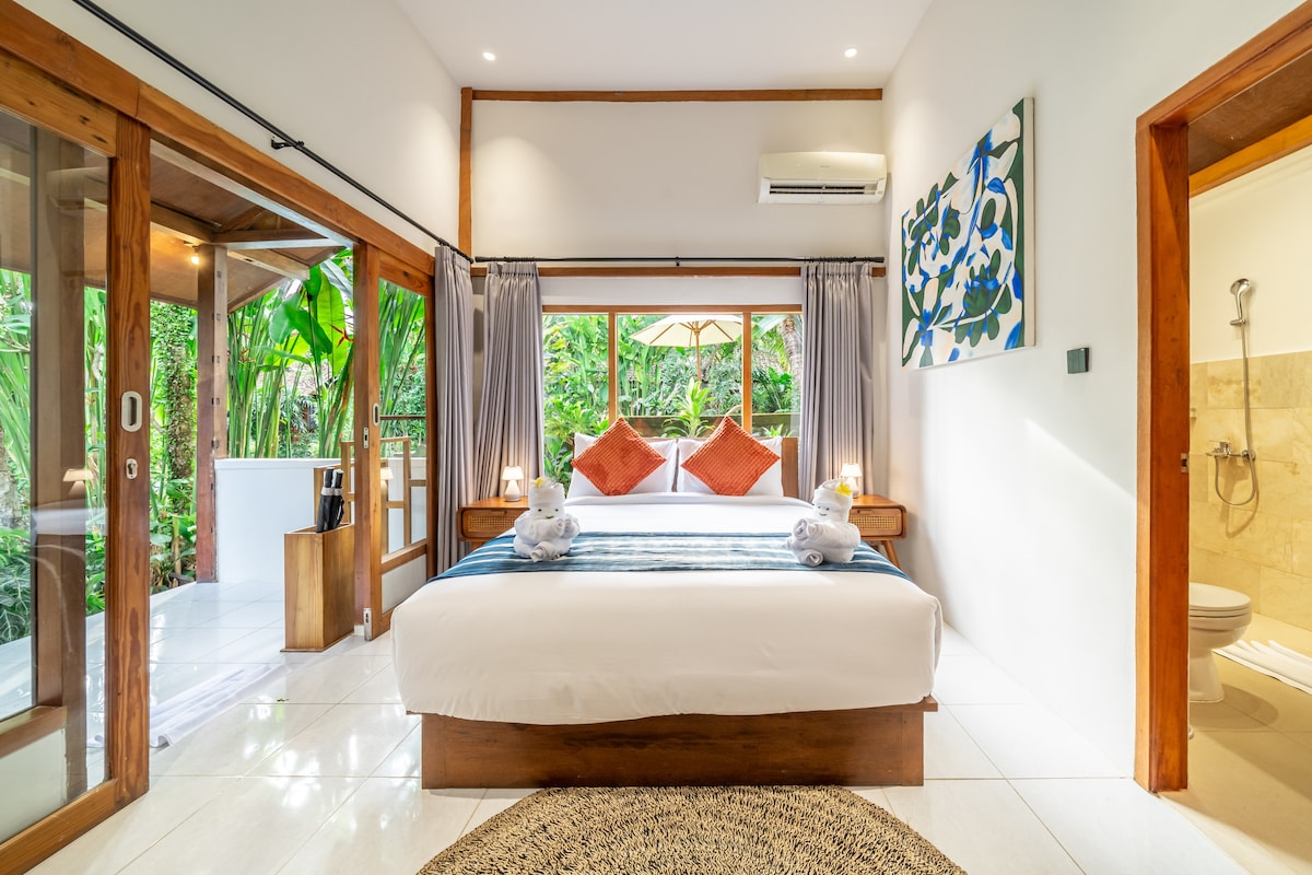 New 1BR Apartment in Central Ubud: • Comfortable king bedroom with floor-to-ceiling windows and jungle/rice-field views from the balcony • Modern bathroom with premium toiletries & hairdryer • Fully equipped kitchenette and dining table • Shared tropical garden, patio and large swimming pool • 300 Mbps Wi-Fi • Daily cleaning, fresh towels & linens included • Baby cot & high chair on request • Netflix & PS5 on request • Concierge service for scooter rental, transfers, spa bookings, tours & more