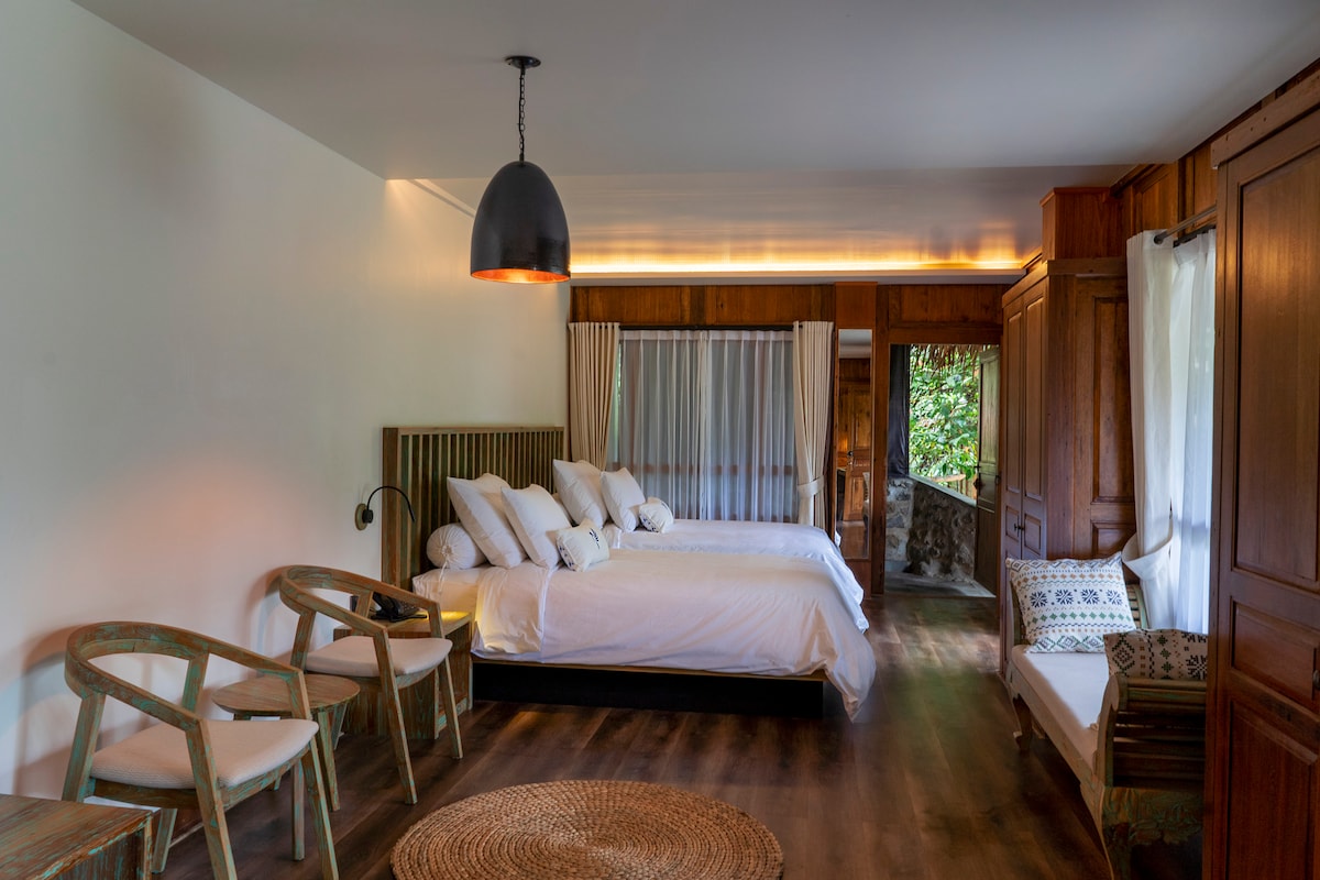 Our one-bedroomed Riverview Pool Villas offer a private sanctuary on the edge of Bentuyung River in a tropical oasis of calm serenity. Enter through a traditional Balinese wooden door to be greeted by the scent of fresh teak in a light-filled suite that includes a king-sized bed, large sofa, and spacious bathroom fitted with a ceramic bathtub and modern rain shower. The bedroom leads to a wide-open terrace and Balinese pavilion next to a pristine private swimming pool