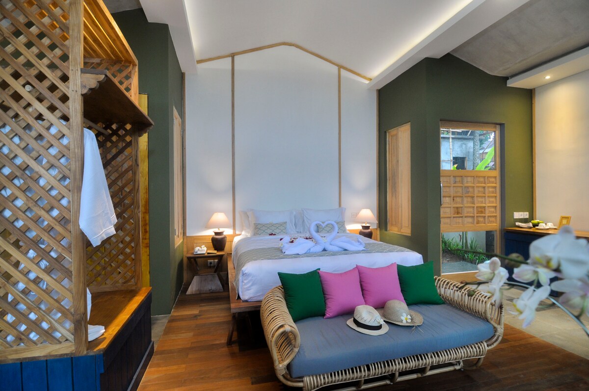 Airy and light style bungalow overlooking the lush tropical garden.Located only minutes from Ubud Market. Check out our IG page for more photos @mudaliving Located in a quiet area less than a 5-minute scooter ride from downtown Ubud, the area is known for its many upscale hotels, along with boutiques, spas, and restaurants. Stroll to local recommendations such as Room 4 Dessert and Naughty Nuri's or be adventurous and try the many independent small cafes.
