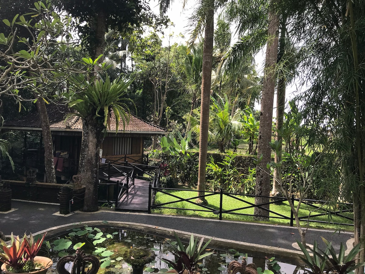 This is very awesome bright modern woodenbedroom with wonderful semi open bathroom also surrouding by greeny open garden view. Perfect for your ultimates Bali's Countryside escape and see real Bali's CULTURE and NATURE Situated behind my beautiful Balinese family compound that separated by beautiful gate. You will be welcomed by original Bali's Engraving architecture, house layout with its own tample. i and my family will taking care of you as a family member. "LIVING THE BALINESE LIFESTYLE"