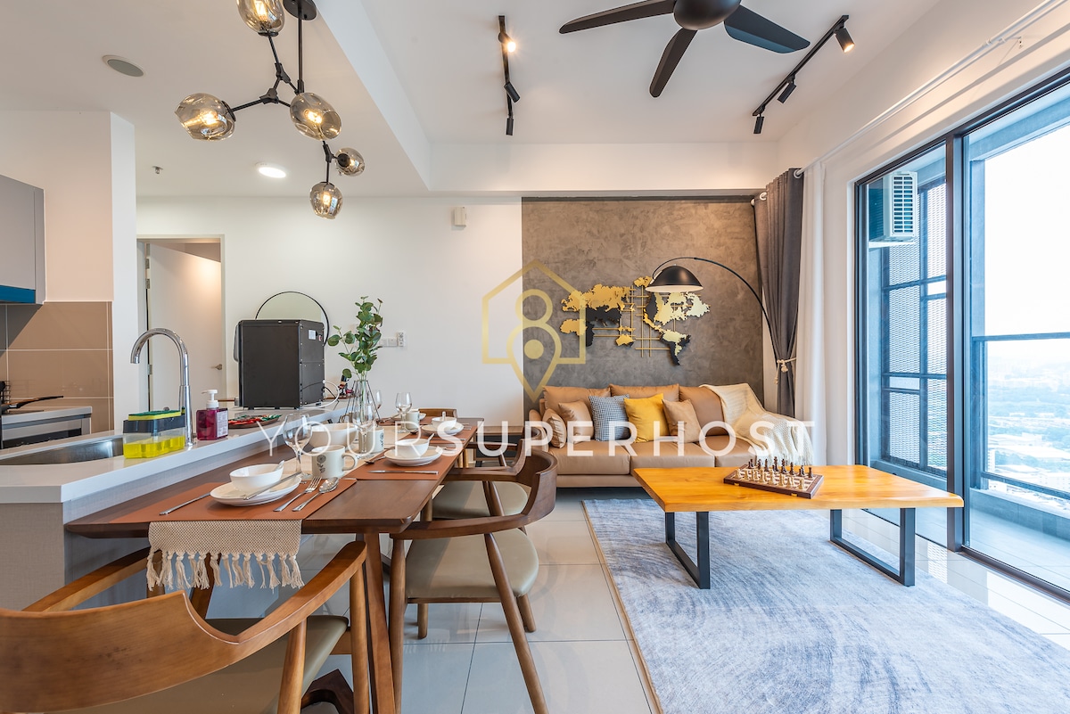 Sit back and relax in this calm, stylish space. Why Seashell suite at Lucentia Residence - Best views of KL - Beautifully decorated with a fun spirit - Centrally located & attached to public transit hub - Fast wifi - 2 TVs with Netflix & others - 2 gorgeous pools - Family friendly with baby crib & highchair - Gym, pool table, BBQ pits, piano - Garage parking - Recommended to Sleeps 6, max 8 person - LaLaPort Shopping Mall & the WOW entertainment street are attached - Grocery, drug store & Cinema