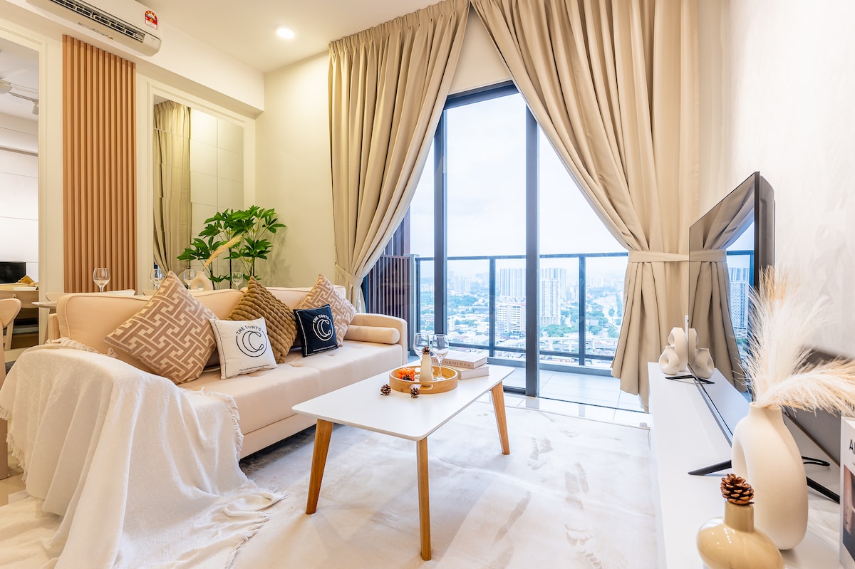 Sit back and relax in this calm, stylish space. Why Seashell suite at Lucentia Residence - Best views of KL - Beautifully decorated with a fun spirit - Centrally located & attached to public transit hub - Fast wifi - 2 TVs with Netflix & others - 2 gorgeous pools - Family friendly with baby crib & highchair - Gym, pool table, BBQ pits, piano - Garage parking - Recommended to Sleeps 6, max 8 person - LaLaPort Shopping Mall & the WOW entertainment street are attached - Grocery, drug store & Cinema