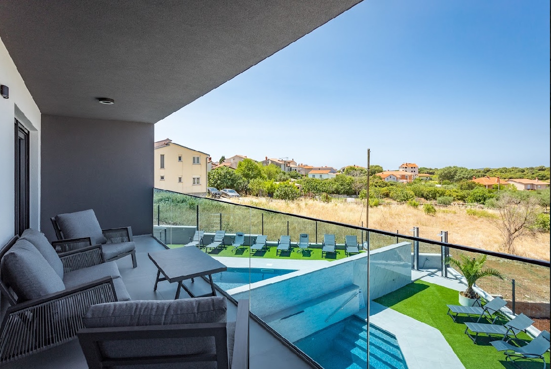 The apartment is located in a private house. The street is quiet. It has private parking and a private pool. The pool is with salt water. The interior is modern. The kitchen is equipped with a dishwasher, refrigerator, stove. In the living room there are a table with 6 chairs, a sofa bed, 3 coffee tables and a TV. Wi-fi is free. The apartment has two rooms with double beds. There are two bathrooms in the apartment. One room has its own bathroom.