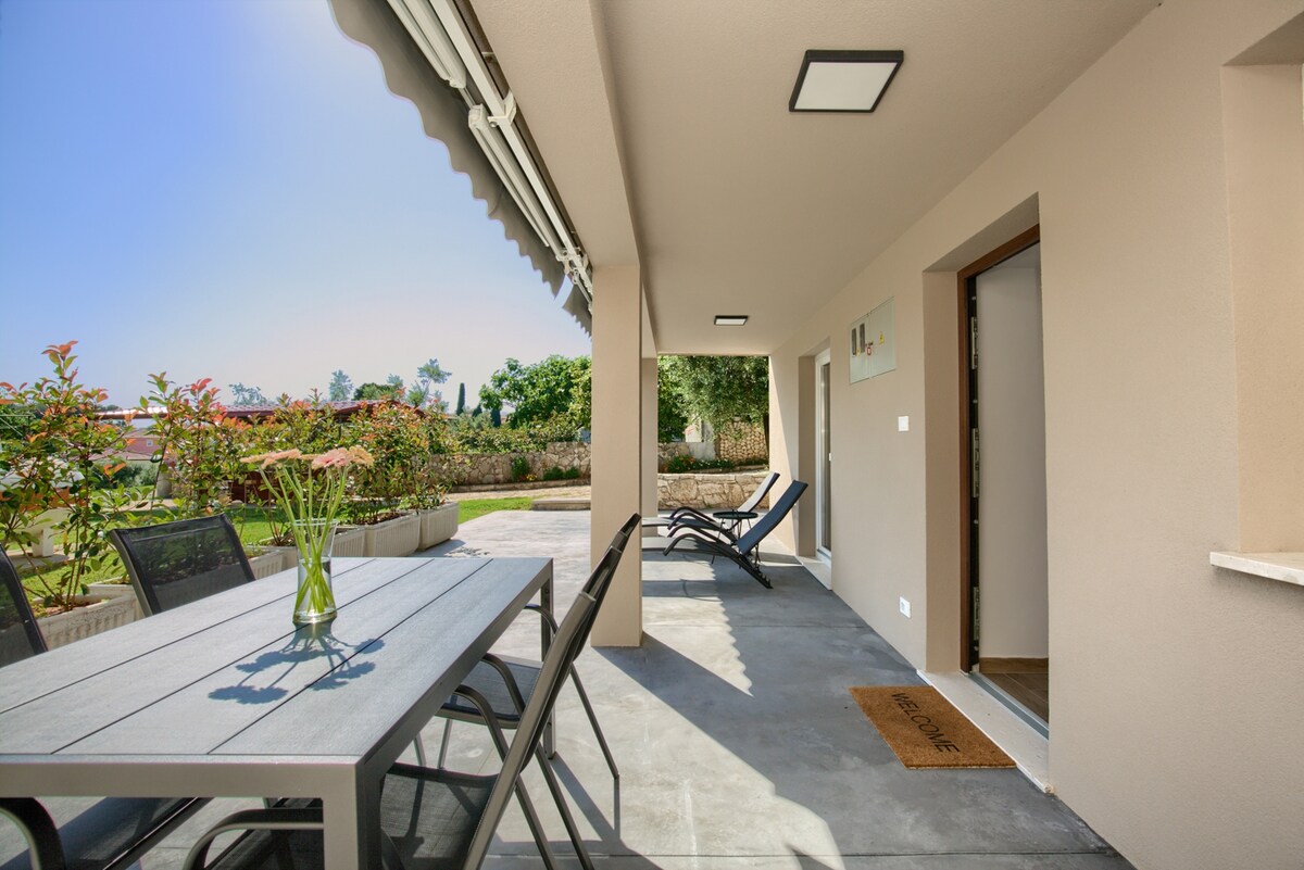 *Walking distance to beach, restaurant, and shops!* Cute apartment with a big seaview terrace in scenic Volme, near Pula. Freshly renovated, with a kitchen, living room, double bedroom, bathroom, and big private terrace with sweeping views of olive groves & the sea. Great for long stays & digital nomads. -Excellent hikes & bike paths nearby -Supermarket, restaurants, and a quiet beach less than 15 min' walk -Very dog-friendly (+€7 per night) -Welcoming, mulitilingual hosts Everyone is welcome!