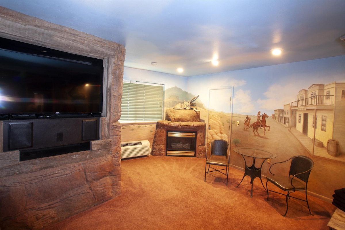 Travel back in time where an adventure awaits you on the wild frontier. Enter the room through the gold mine shaft where you'll find yourself in the middle of an old West town. Visit the bath house for a relaxing soak in the sunken jetted tub filled from a water trough or shower under a watering can. Rest on the queen sized bed at the Hotel while you watch the 50" plasma TV.The Black Swan Inn is locally owned and strives to provide guests with a unique experience.