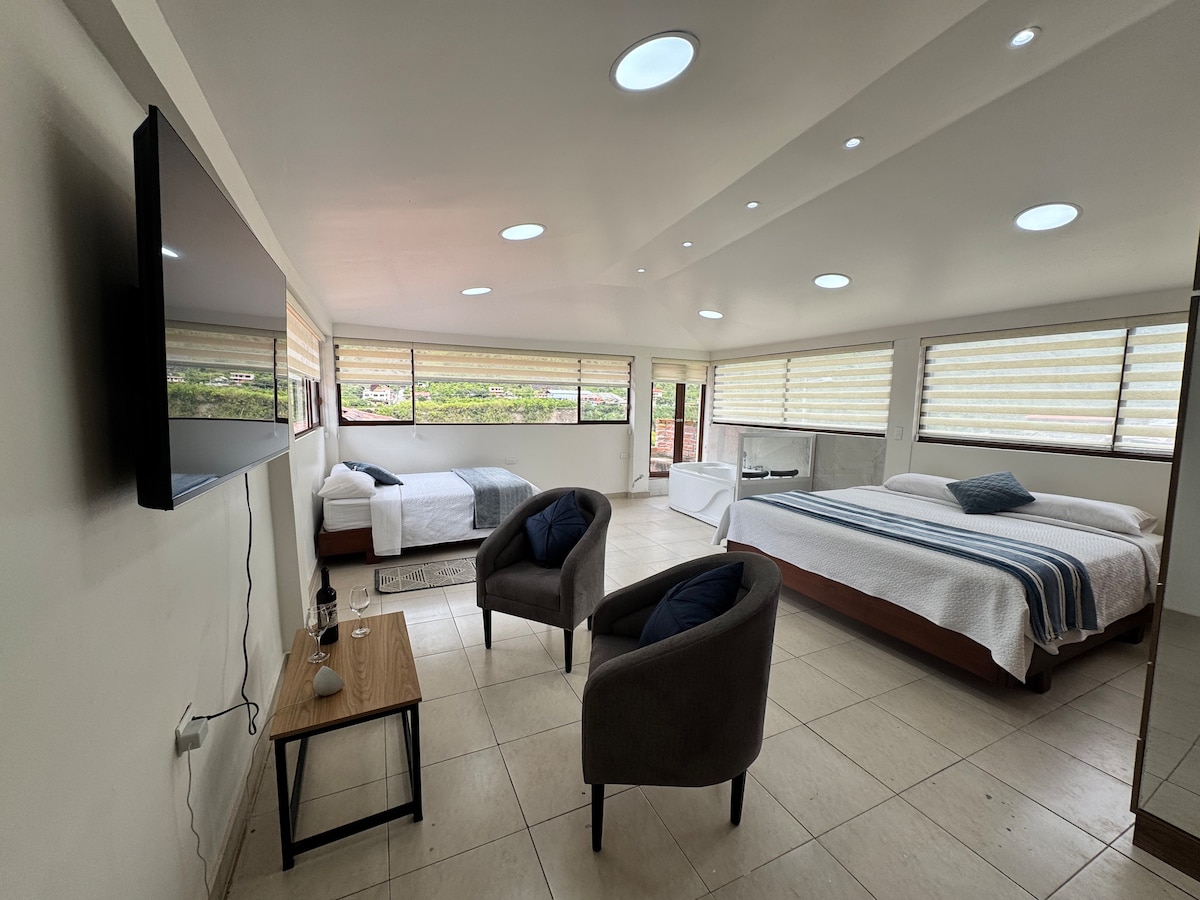 Bienvenidos a nuestra suite con impresionantes vistas a la ciudad. Este elegante y moderno espacio es perfecto para aquellos que buscan una experiencia única y relajante durante su estancia. Ubicada en el corazón de la ciudad, esta suite te coloca a pocos pasos de los lugares más emblemáticos y vibrantes de la ciudad.