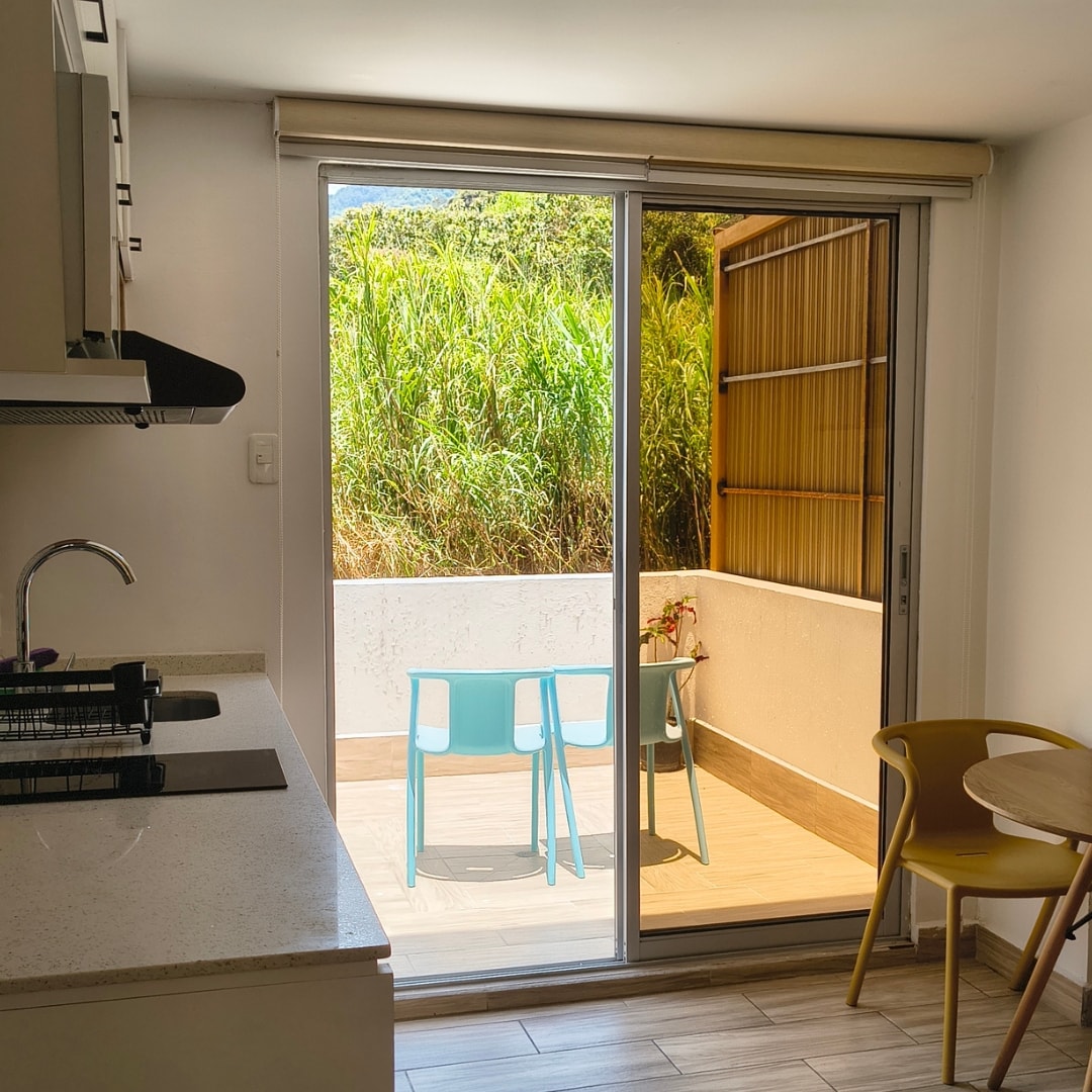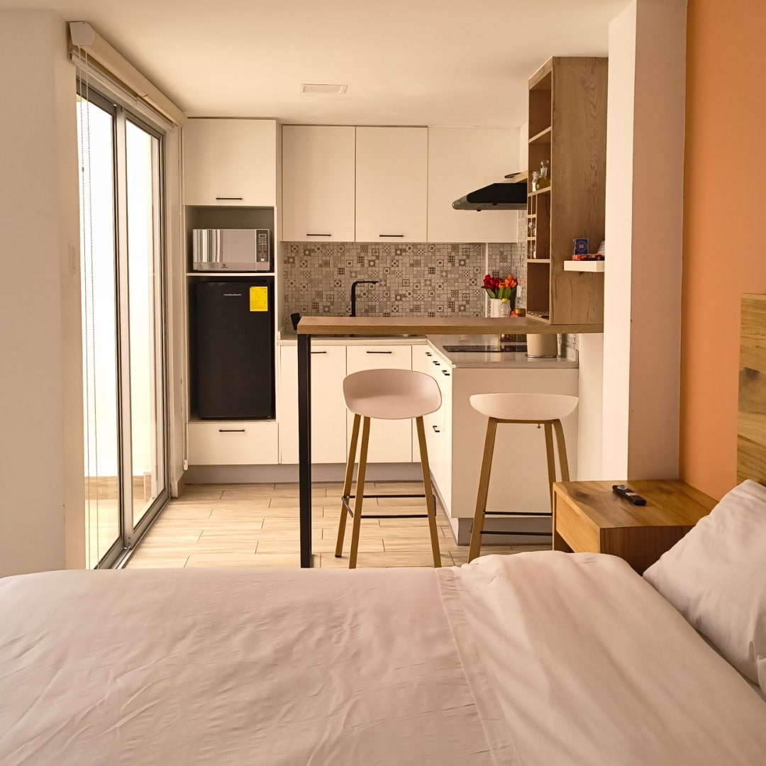 Es un lugar acogedor, con todos los servicios que puedas necesitar. Es perfecto para el fin de semana, esas dos noches que necesitas salir de tu rutina, es excelente para parejas. Agua caliente en la ducha, WiFi, cocina, nevera, licuadora y microondas.