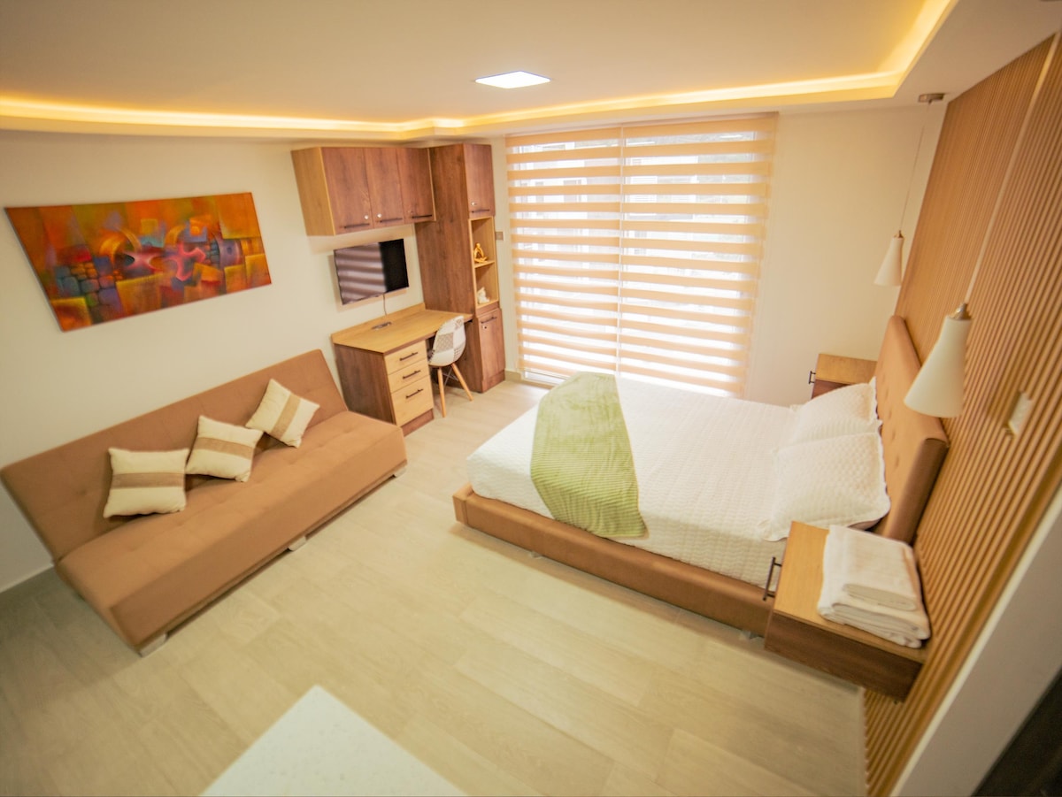 Disfruta de una suite abierta y luminosa con una vista inigualable a la vegetación de Baños. Equipada con una cómoda cama de 2.5 plazas, sofá cama, cocina, comedor, baño privado y una pequeña sala para relajarte. Ideal para parejas, familias pequeñas o viajeros que buscan confort y naturaleza en un solo lugar. ¡Ubicación privilegiada y ambiente acogedor!