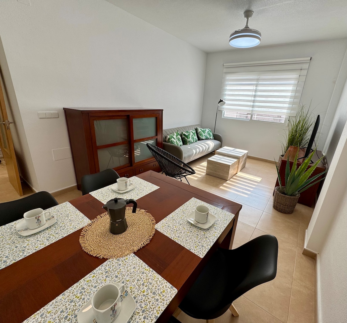 Amplia casa en bajo con buena luz natural en una de las zonas más tranquilas de Molina de Segura y muy cerca de Murcia y el campo de golf de Altorreal. La vivienda esta muy bien comunicada: cerca de todo tipo de comercios (supermercados, farmacia, carnicería etc..) amplia zona verde a 1 minuto andando. Fácil aparcamiento en la misma puerta. La televisión Smart tv está colocada de manera estratégica para que se pueda ver desde el patio también, simplemente girándola.