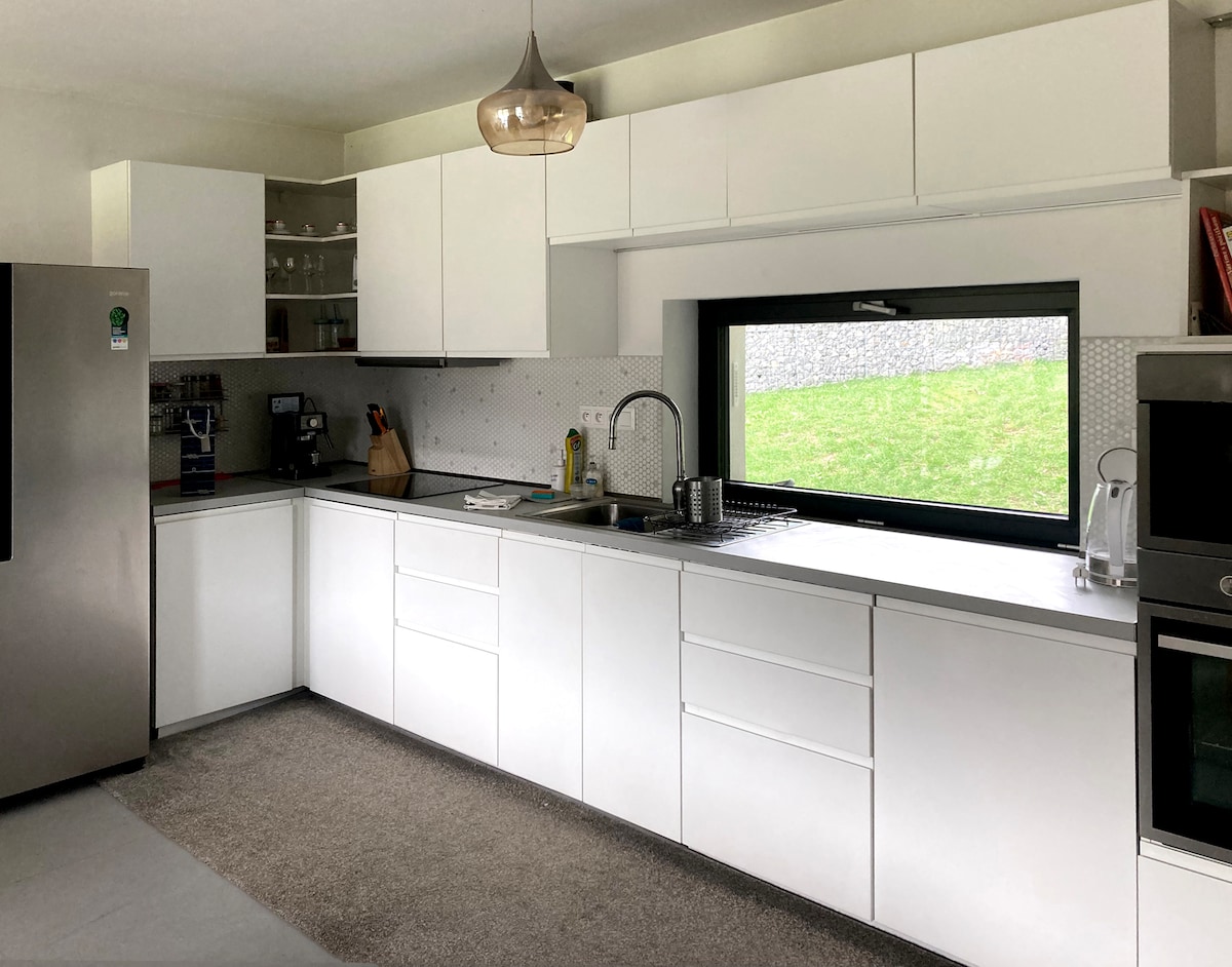 On the ground floor there is a spacious living room with a fireplace, connected to the kitchen with a large table (12 seats). The kitchen has a tiled stove with an oven, an electric oven, an induction hob, a microwave oven with a grill, a fridge with a freezer, an espresso machine (15 bar), a toaster, a dishwasher. Washing machine in the bathroom with a shower corner and a sink, as well as a separate toilet with a sink. Upstairs there are 3 bedrooms and a bathroom with a bathtub and a sink.