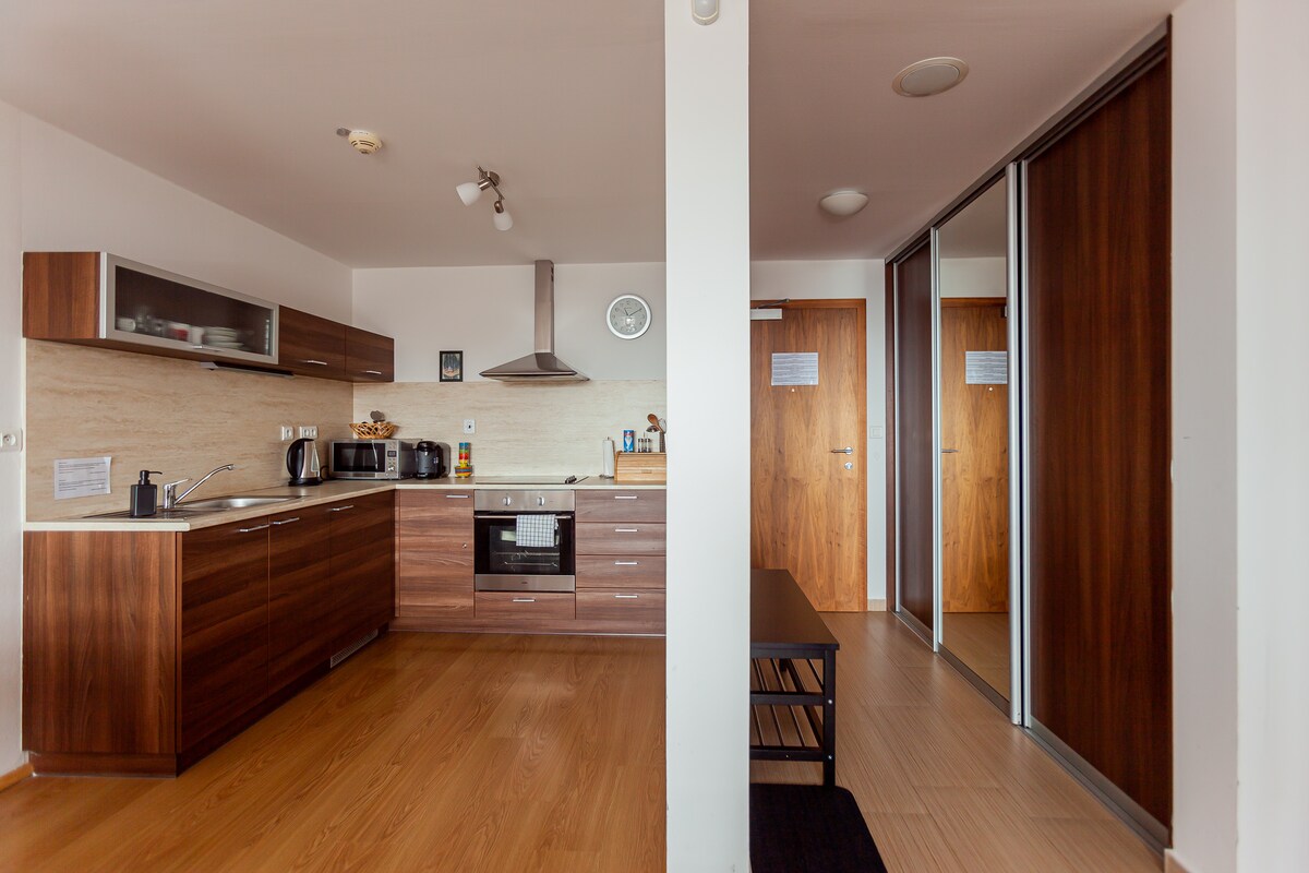 Útulný súkromný apartmán len kúsok od centra mesta. Susedí s krásnym parkom, kde je dráha pre korčuliarov. Je tichý, veľmi svetlý. Apartmán je súčasťou hotelového komplexu Lux. Do centra sa dostanete pešo 5 minút. Je jedinečný loftovým miestom na spanie /2 plnohodnotné matrace, každý o rozmere 80×200cm/. Kompletne vybavená kuchyňa je súčasťou obytného priestoru. Pre hostí je k dispozícii zastrešené parkovacie miesto /označenie 2E/za rampou so svetelným senzorom a kamerovým systémom.