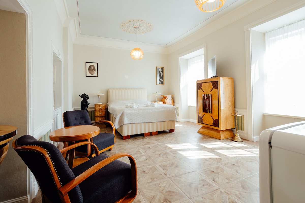 Stylish spacious apartment with shared bathroom and kitchen close to the town centre, in which elements of historicist style are complemented by modern minimalism. The apartment is located in the historical building of the former Bretschneider shoe factory, which lies close to the square and other attractions, only a few minutes on foot. Nearby are to be found: restaurants, pubs, grocery shop, bowling, Glanzenberg mine. This accommodation is fit for couples, families or other groups of 4.