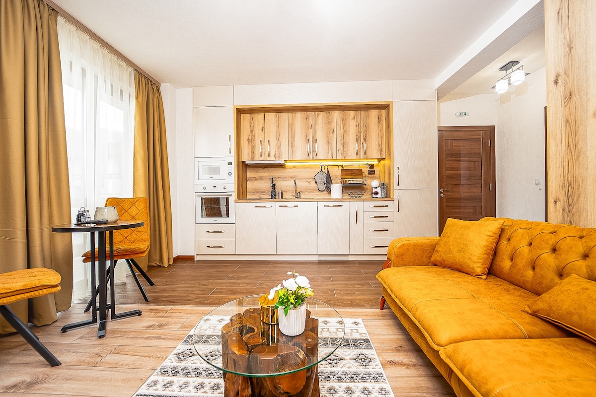 Luxury apartment, situated in the heart of Bansko- on the Main Street, just next to the main ski lift. The apartment is 70m2 and offers the perfect vacation for a family/group of friends up to 4. The apartment: - A big open space living room with fully equipped kitchen, dining table, comfortable and large sofa (full bed option), TV, high speed internet, very nice view of the city and mountains. - Spacious bedroom , with comfortable bed, large wardrobe and TV. - Modern and large bathroom.