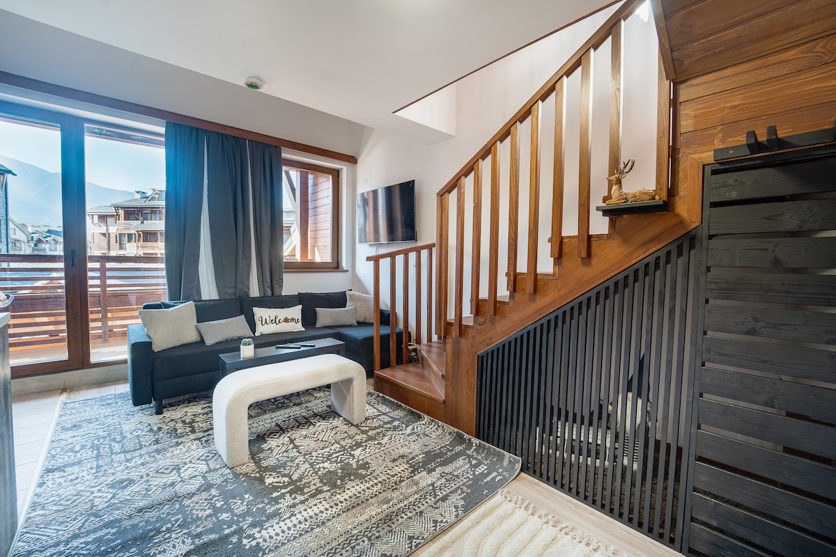 Enjoy this modern-designed one-bedroom apartment on two levels in a beautiful complex with an amazing view. The alpine interior design will bring you a warm feeling after a day in the mountains.. The complex itself is situated in a beautiful mountain area at the foot of the Pirin mountain, in the southern part of Bansko resort, east of the ski slopes. WiFi connection covers the entire property.