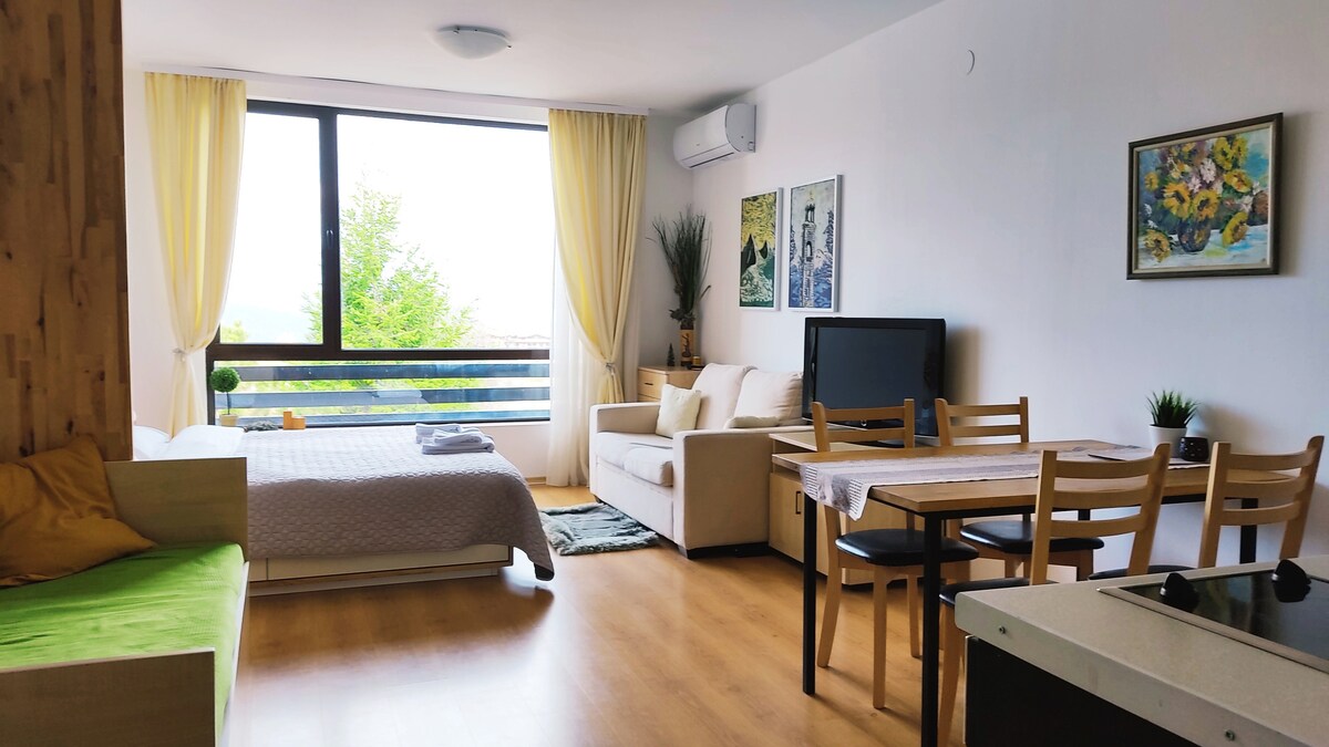 Big 39m2 studio for up to 3 adults, 10 minutes away from the gondola by a minibus, is warm (has an inverter AC), has fast & stable 5G WiFi, full kitchen, access to a nice & warm spa, nearby restaurant, free gated parking space, laundry room. Shuttle bus is available during winter season, the schedule is consistent and it drives you: -from the hotel to the gondola: 8:30AM, 9:30AM -from the gondola to the hotel: 3:00PM, 4:30PM Shuttle bus ticket per person: 5 euros Spa ticket per person: 13 euros