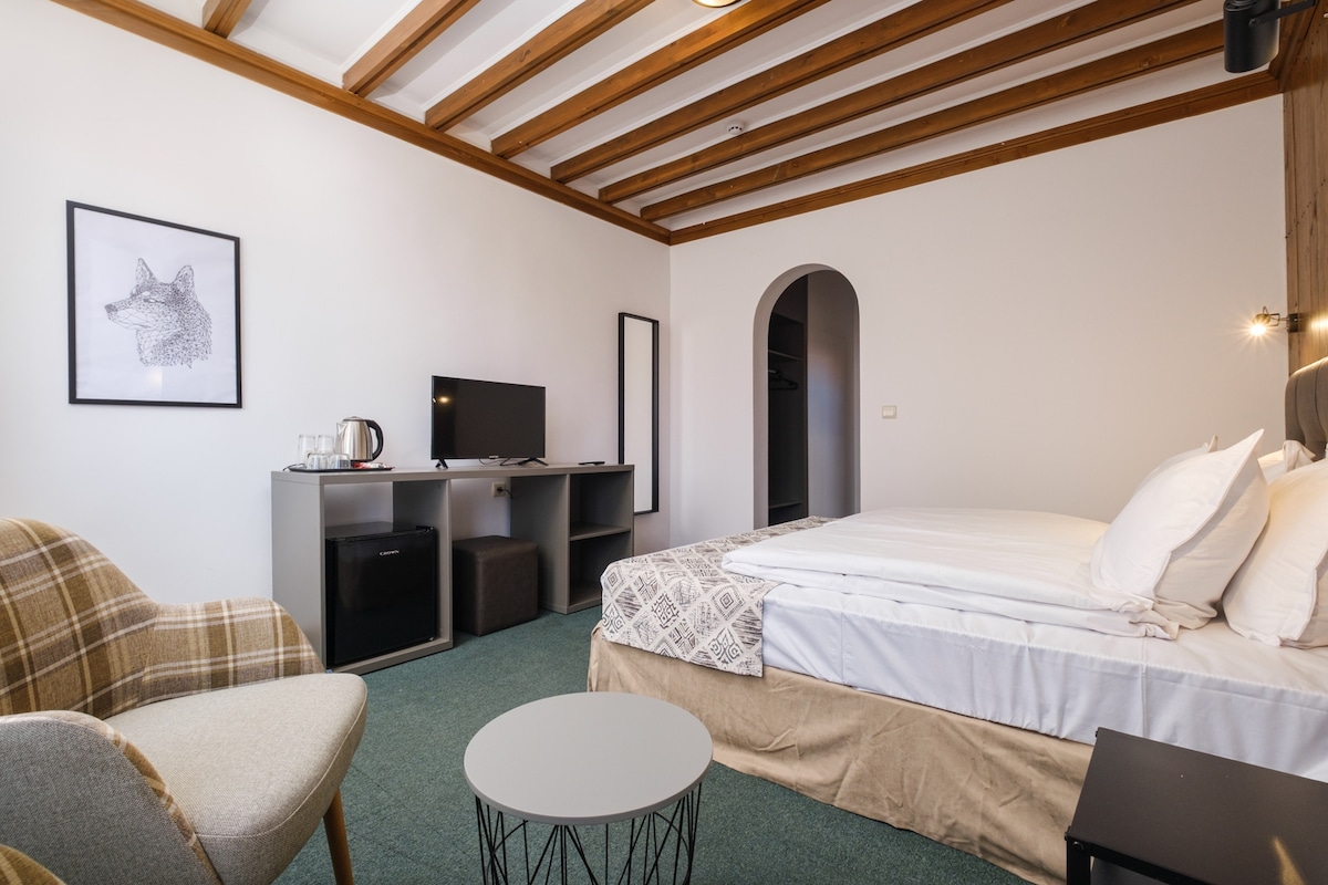 Няма как да не оцените вниманието към детайла в това стилно място. Насладете се на живописна гледка към планината и усетете чистия планински въздух. Всички наши двойни стаи са с отделни легла, но с опция за поставяне на топ матрак. В този тип стая могат да бъдат настанени максимум двама възрастни и едно дете.