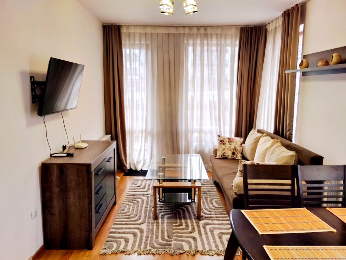 The comfortable apartment is located 100 meters from the ski lift in the complex "Bansko Royal Towers" The apartment ideal for 4 persons 1 bedroom with a bed 1 sofa bed for 2 persons 1 bathroom fully equipped with all amenities For you in the apartment - air conditioning, fully equipped kitchen, TV, internet Shops, restaurants, ski equipment rental within walking distance View of ski slopes and mountains For an additional fee - Gym are also located on same complex