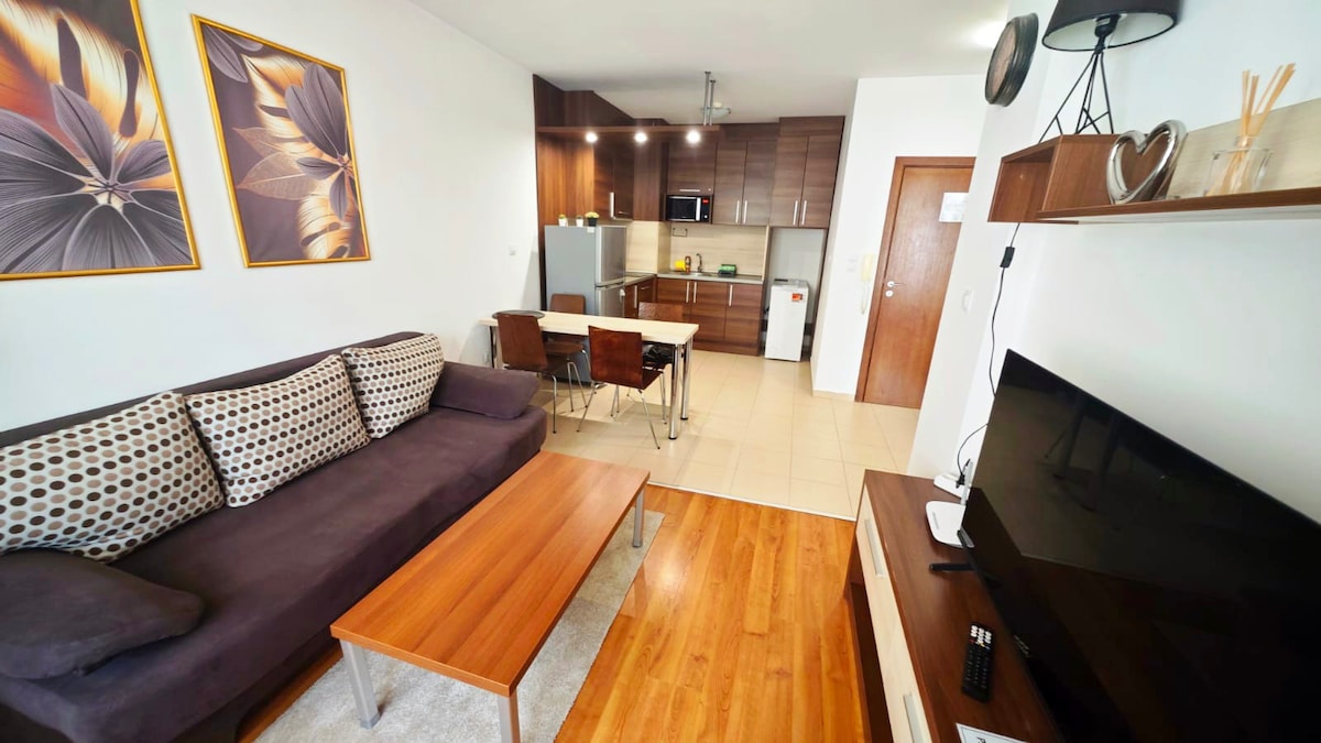 Luxury apartment, situated in the heart of Bansko- on the Main Street, just next to the main ski lift. The apartment is 70m2 and offers the perfect vacation for a family/group of friends up to 4. The apartment: - A big open space living room with fully equipped kitchen, dining table, comfortable and large sofa (full bed option), TV, high speed internet, very nice view of the city and mountains. - Spacious bedroom , with comfortable bed, large wardrobe and TV. - Modern and large bathroom.