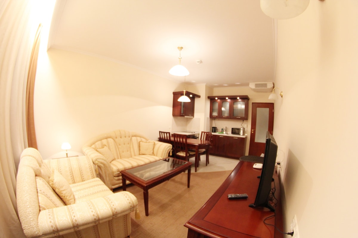 Stay at our 3 stylish apartments in the brand-new complex Downtown Bansko Resort opposite to the ski funicular and only 100 m distance to ski funicular's entrance . Unique view of mountains and of the river Glazne . A comfortable accommodation for up to 12 guests in a fully-equipped 3 apartments ( each 75m2) , including air conditioning. Enjoy our full equipped kitchens and a spacious bathrooms. The classic colors makes the interiors bright and joyful.
